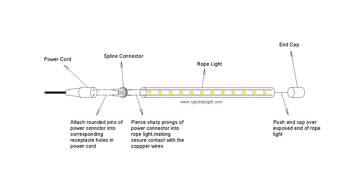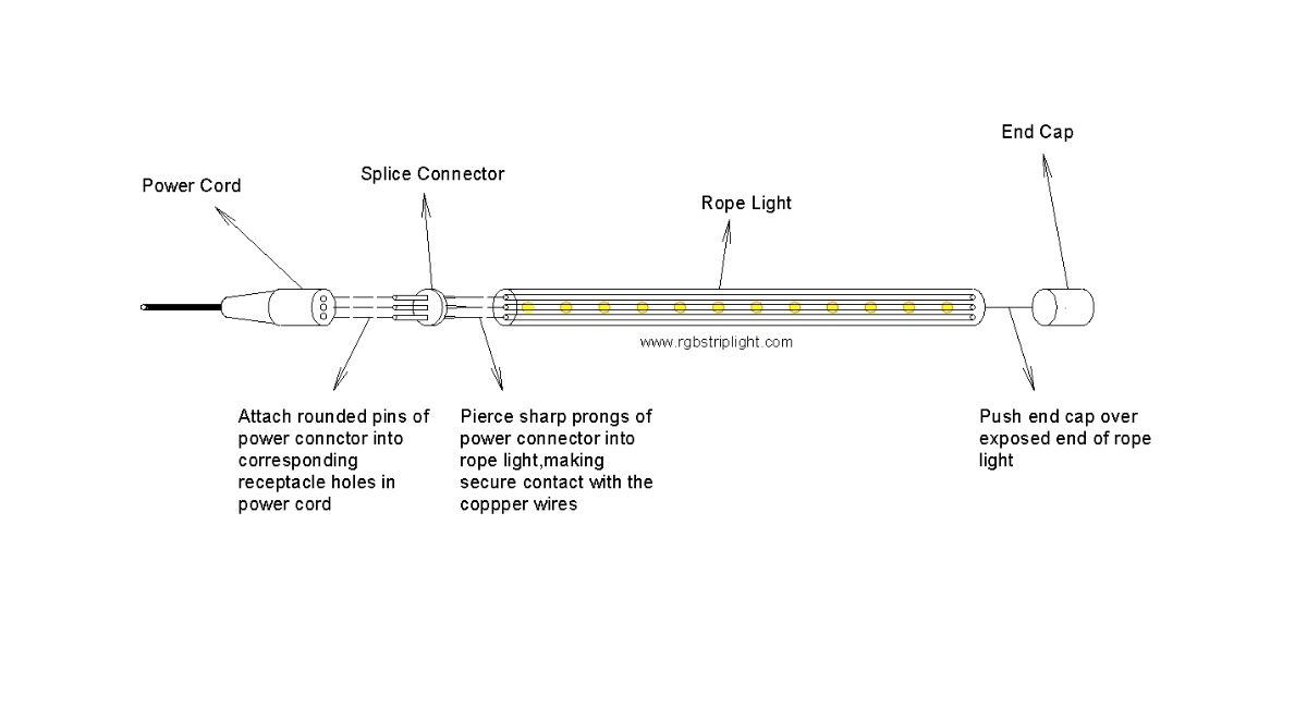 - Use the heat-shrinkable tube cover at the joining parts, end of the rope lights with end caps, and sealing accessories.